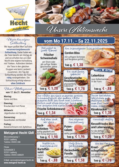 frisch eingetroffenwöchentliche Speisekarte und Angebote KontaktWir freuen uns auf SieEmailservice@metzgerei-hecht.deTelefonHauptgeschäft 09492 288AdresseBlossenbergweg 1 92331 Lupburg Name Telefon Email Adresse Nachricht Datenschutz Datenschutz Ich stimme zu, dass meine Angaben aus dem Kontaktformular zur Beantwortung meiner Anfrage erhoben und verarbeitet werden. Weitere Informationen: Datenschutzerklärung 2 + 2 = absenden