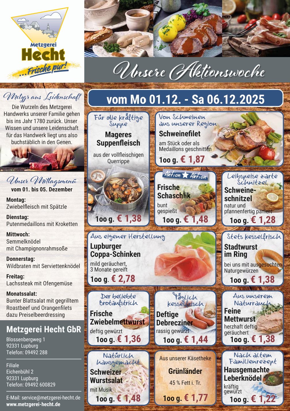 frisch eingetroffenwöchentliche Speisekarte und Angebote KontaktWir freuen uns auf SieEmailservice@metzgerei-hecht.deTelefonHauptgeschäft 09492 288AdresseBlossenbergweg 1 92331 Lupburg Name Telefon Email Adresse Nachricht Datenschutz Datenschutz Ich stimme zu, dass meine Angaben aus dem Kontaktformular zur Beantwortung meiner Anfrage erhoben und verarbeitet werden. Weitere Informationen: Datenschutzerklärung 11 + 6 = absenden